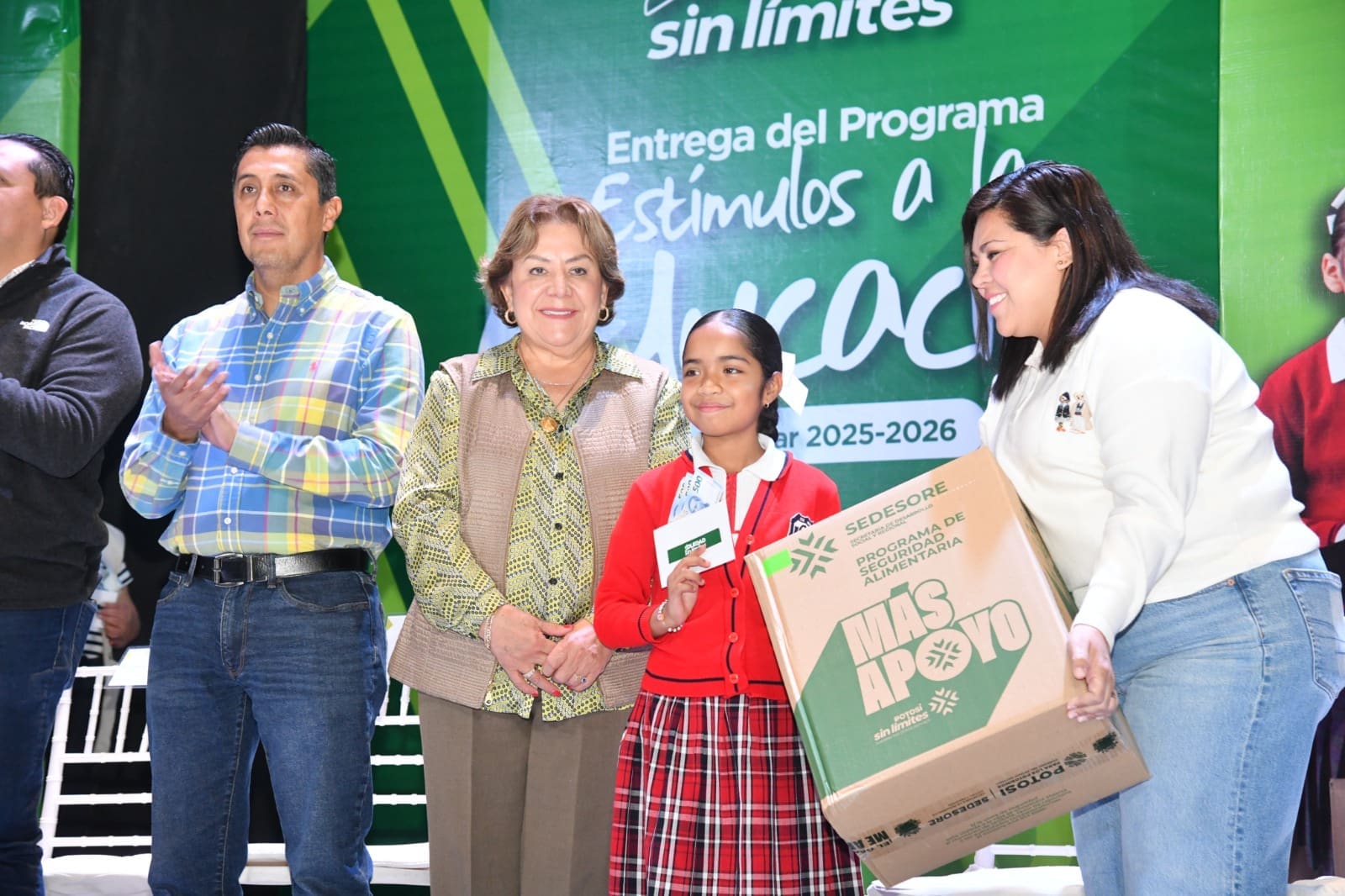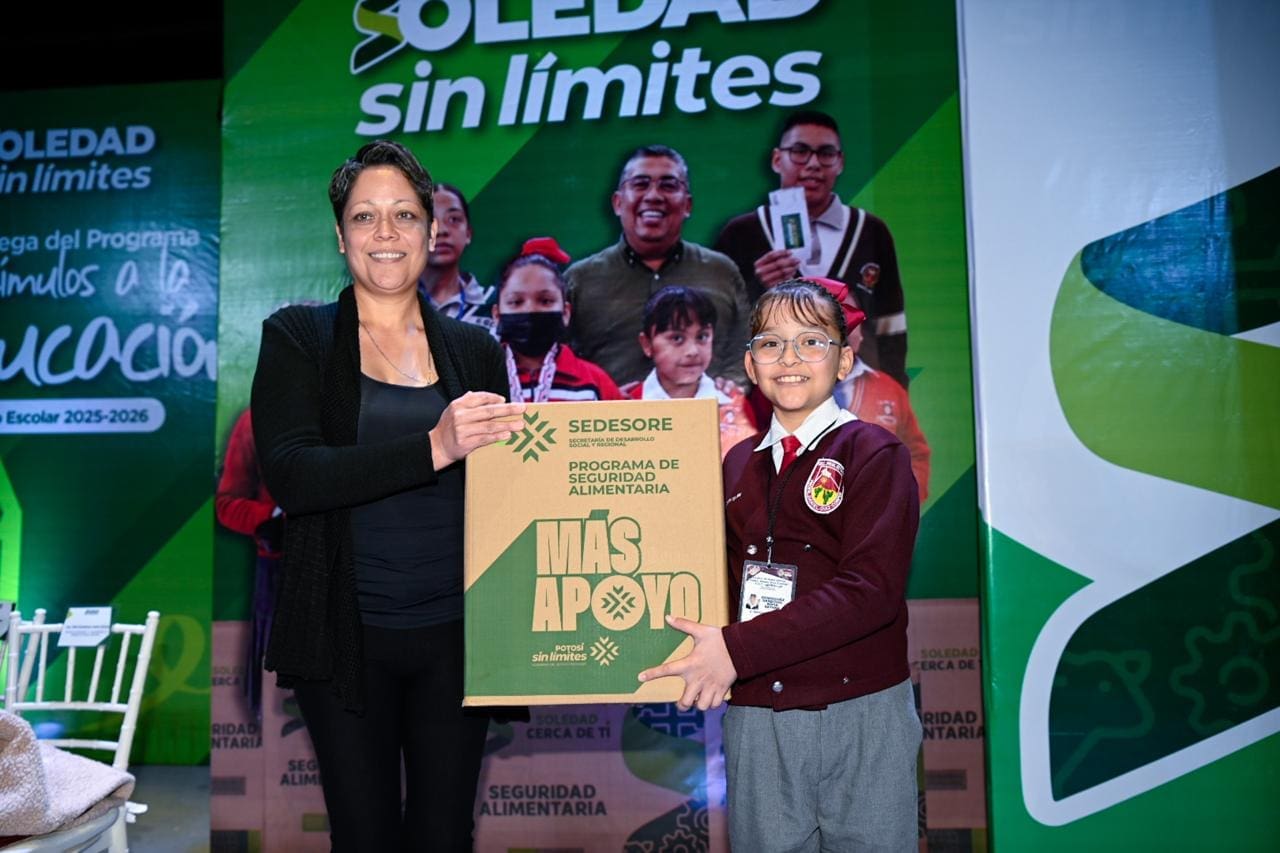 Juan Manuel Navarro Muñiz, Alcalde de Soledad de Graciano Sánchez, reafirmó el compromiso de su Gobierno con la educación continua de niñas, niños y adolescentes del municipio, al instruir la realización de una nueva entrega del programa Estímulos a la Educación, dirigido a estudiantes de primaria y secundaria que mantienen promedios superiores a 8.5; gracias a esta política pública, las y los beneficiarios recibieron un apoyo económico de mil 500 pesos y un paquete alimentario que fortalece directamente a sus familias y respalda su desarrollo escolar.