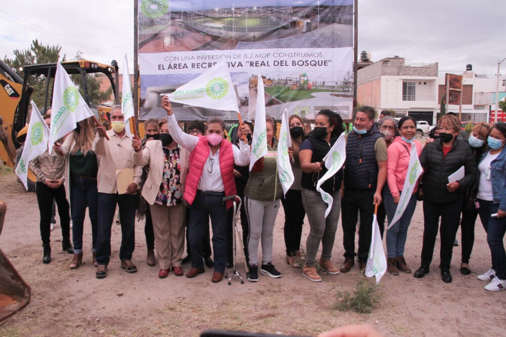 La alcaldesa de Soledad de Graciano Sánchez, Leonor Noyola Cervantes, acompañada de integrantes del gabinete municipal e invitados especiales, pusieron en marcha la construcción del parque urbano multifuncional Real del Bosque; obra que favorecerá a por lo menos diez mil quinientos habitantes que residen en la zona.
