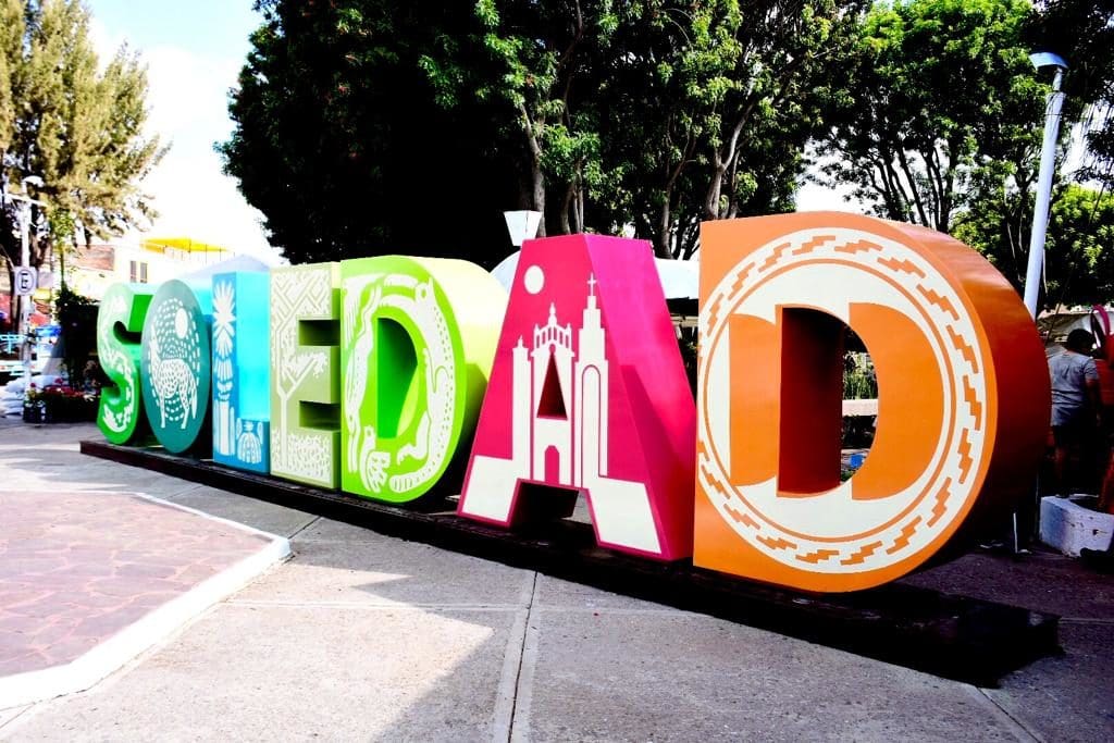 Las letras que forman la palabra “Soledad” son de distintos y vistosos colores, con figuras en blanco de imágenes que representan algunos aspectos de nuestra riqueza cultural como sus monumentos, flora y fauna.