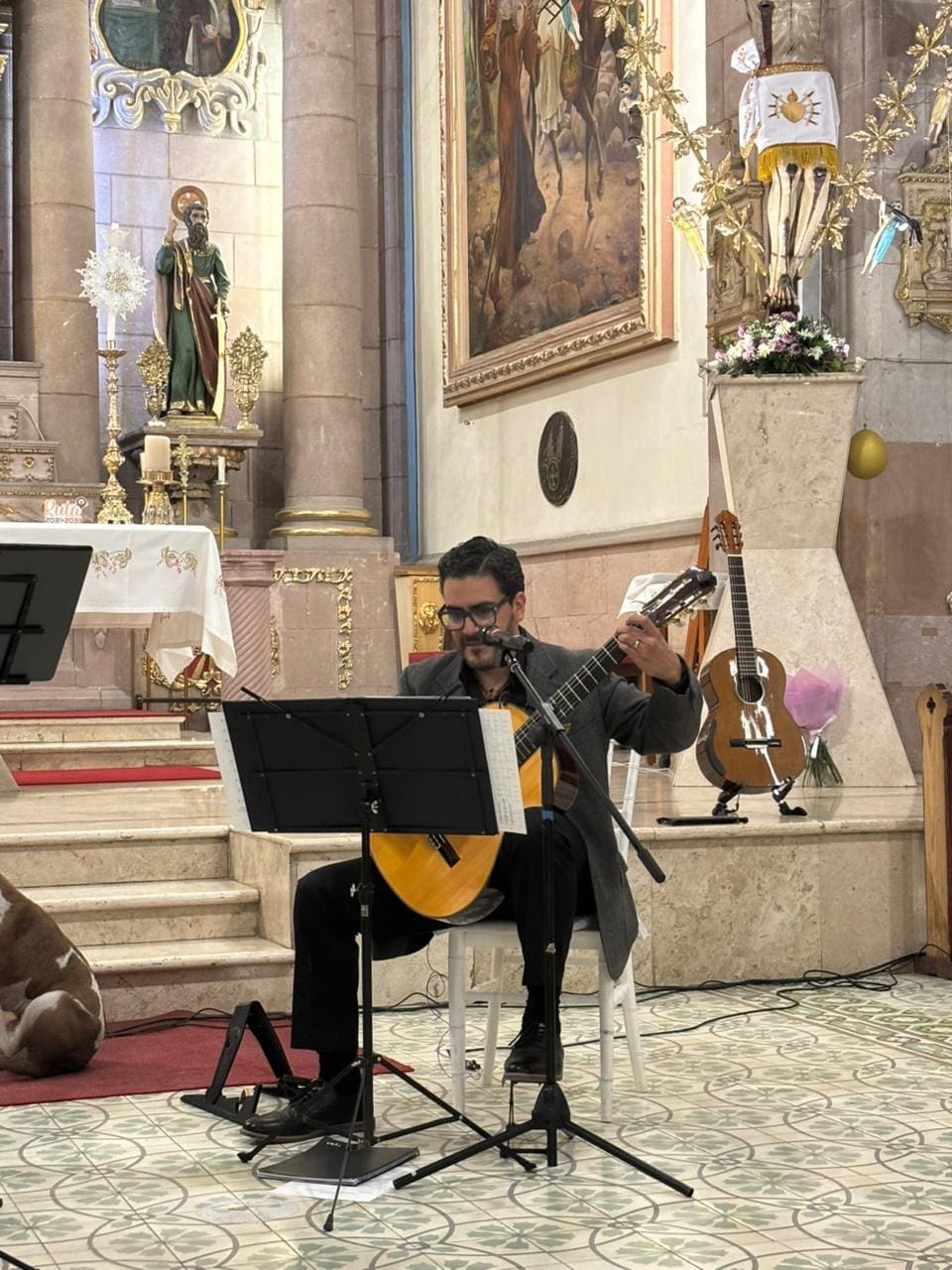 Durante la presentación, las luces de las velas acompañaron las arias y piezas interpretadas por los concertistas Esmeralda Barrientos, Martha Mata y Santiago Buell Pesci, del Instituto Potosino de Bellas Artes, en una atmósfera que conmovió incluso a “Ruffo”, un perrito que se sumó silenciosamente a la audiencia desde el altar.