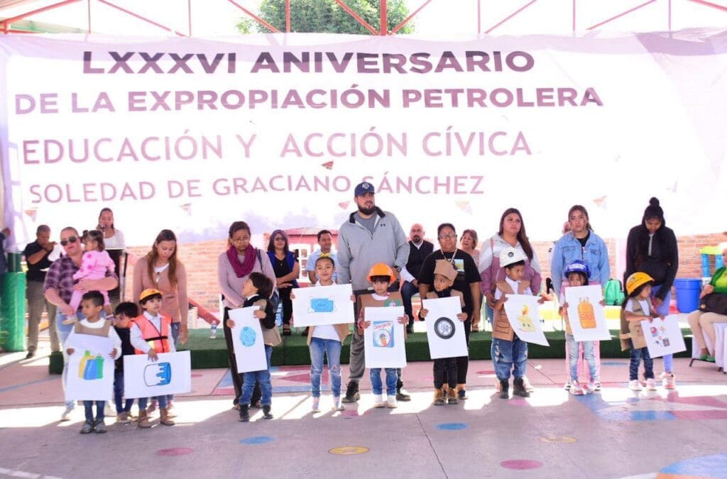 Con la finalidad de incentivar el patriotismo entre la niñez y forjar su educación integral, este martes, el Gobierno Municipal de Soledad de Graciano Sánchez celebró un acto cívico en el Jardín de Niños «María del Carmen Licona» en la colonia Villa de Cactus, para conmemorar el 86 aniversario de la Expropiación Petrolera.