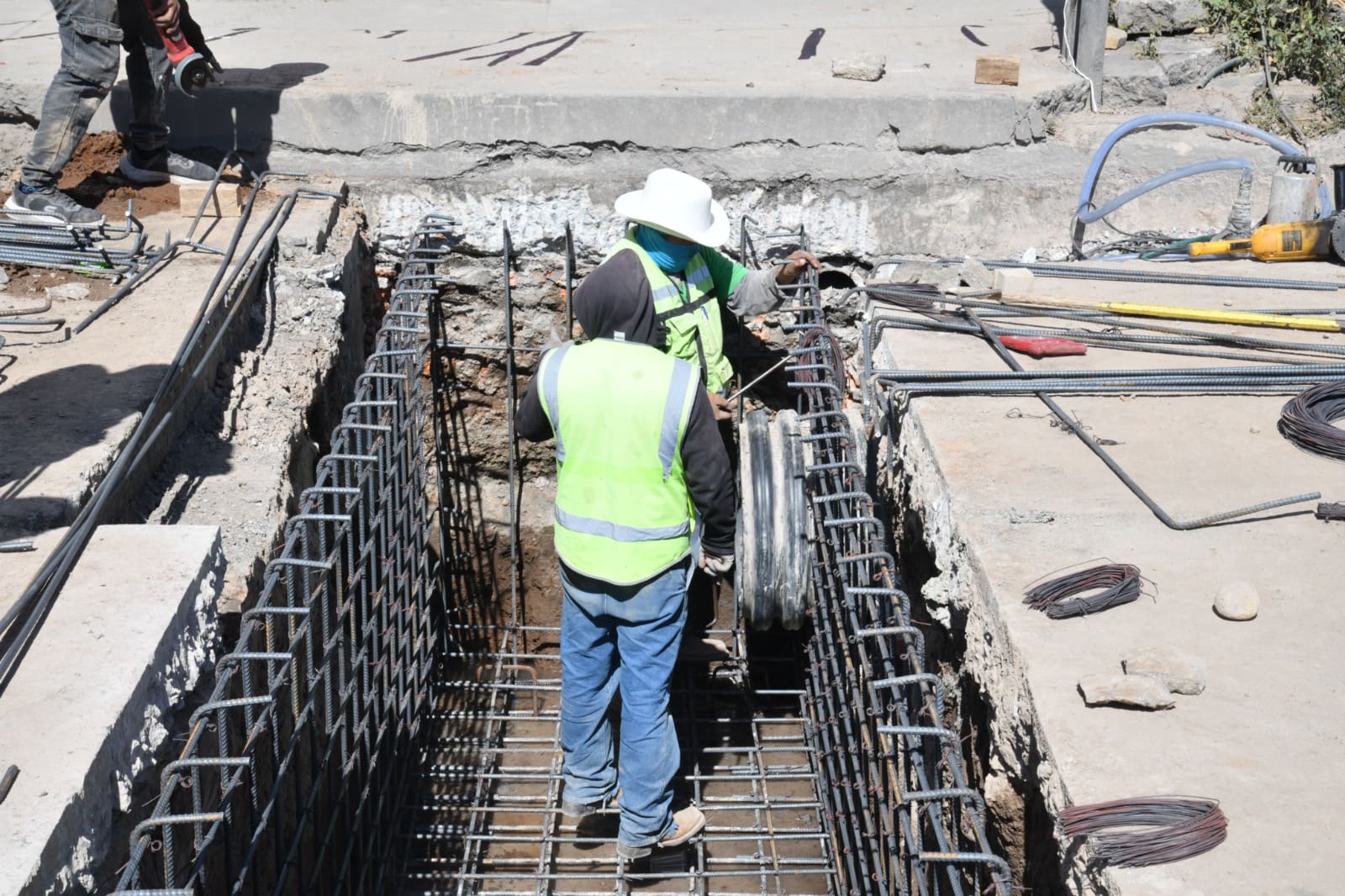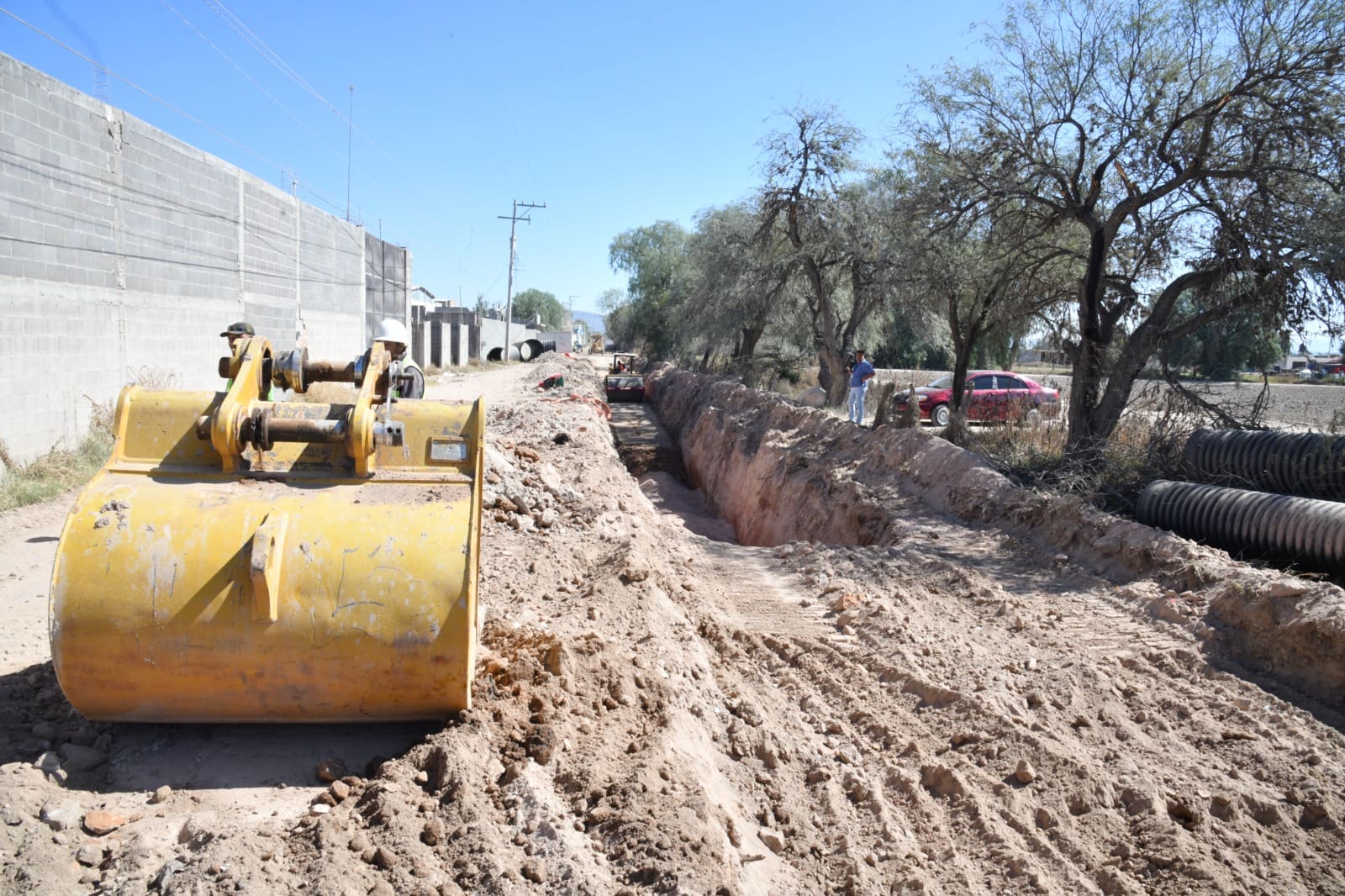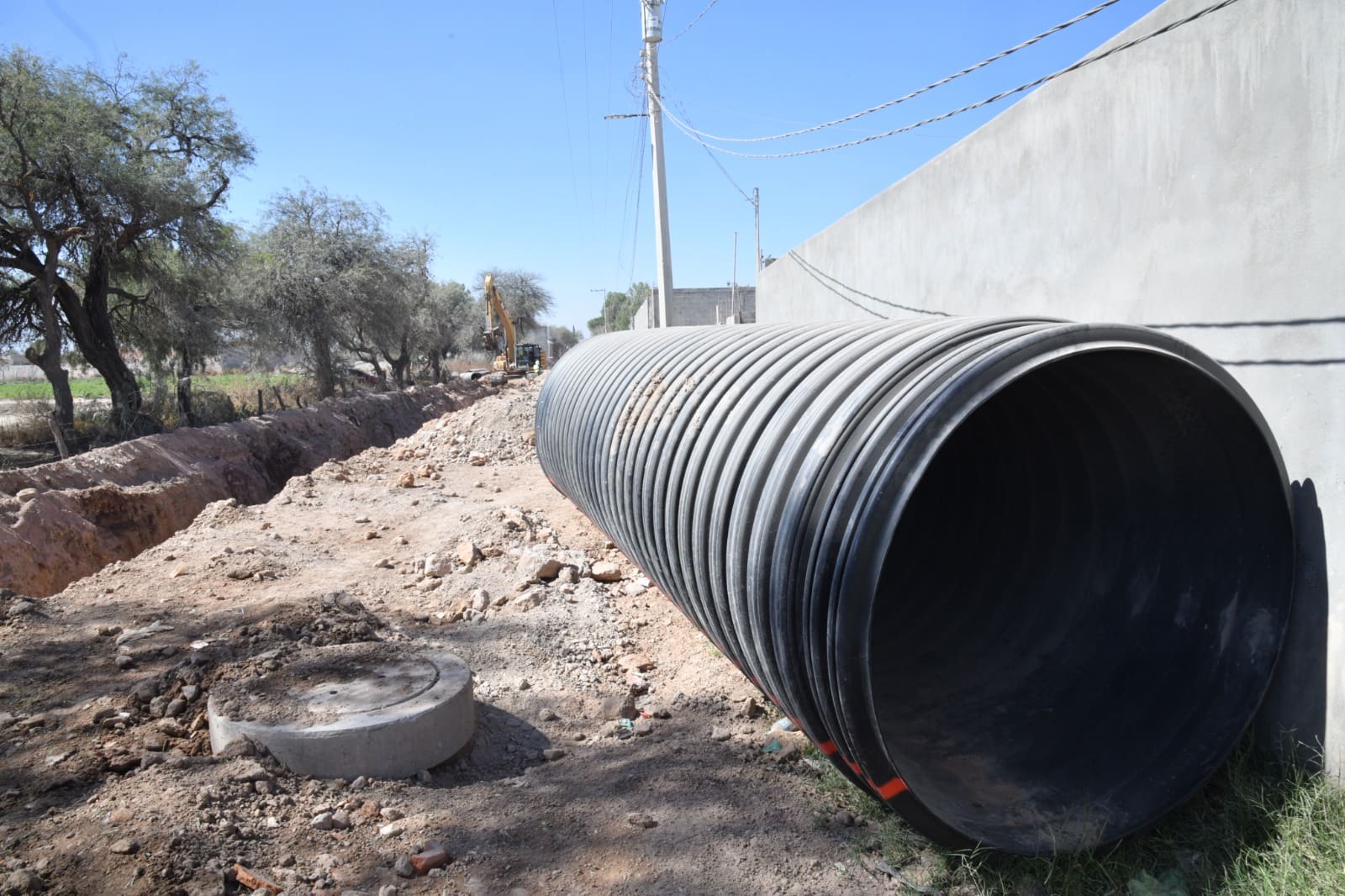 Sobre la colonia Privadas de la Hacienda, explicó, se han instalado aproximadamente mil 200 metros lineales del colector, que incluye una tubería de 60 pulgadas; la red de drenaje sanitario registra un progreso del 80 por ciento y se siguen culminando pozos de visita, estimando que la obra esté en operación a inicios del año 2026.