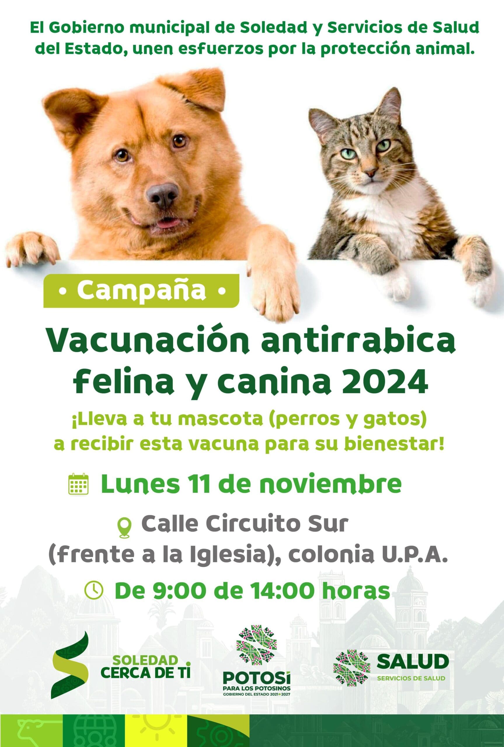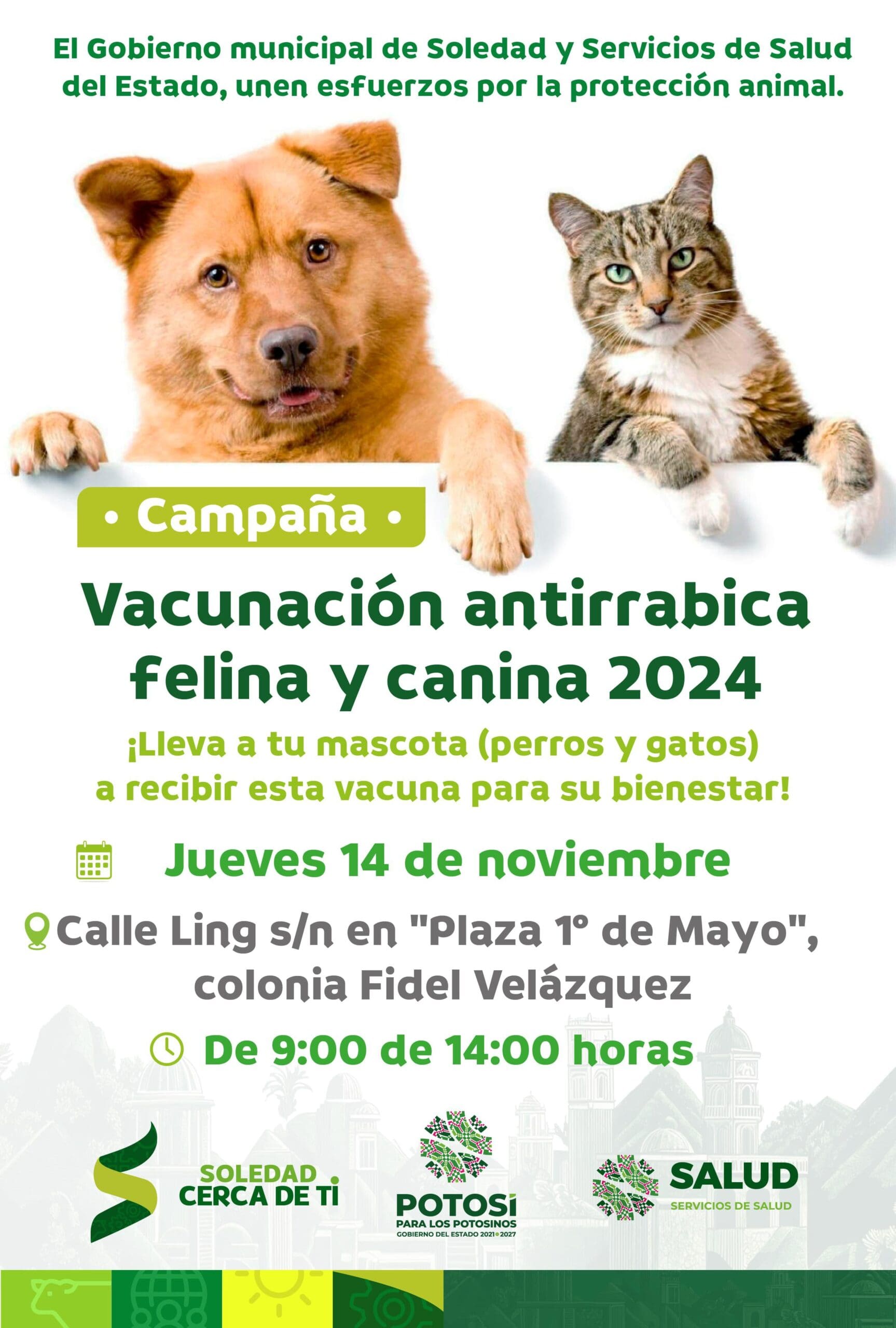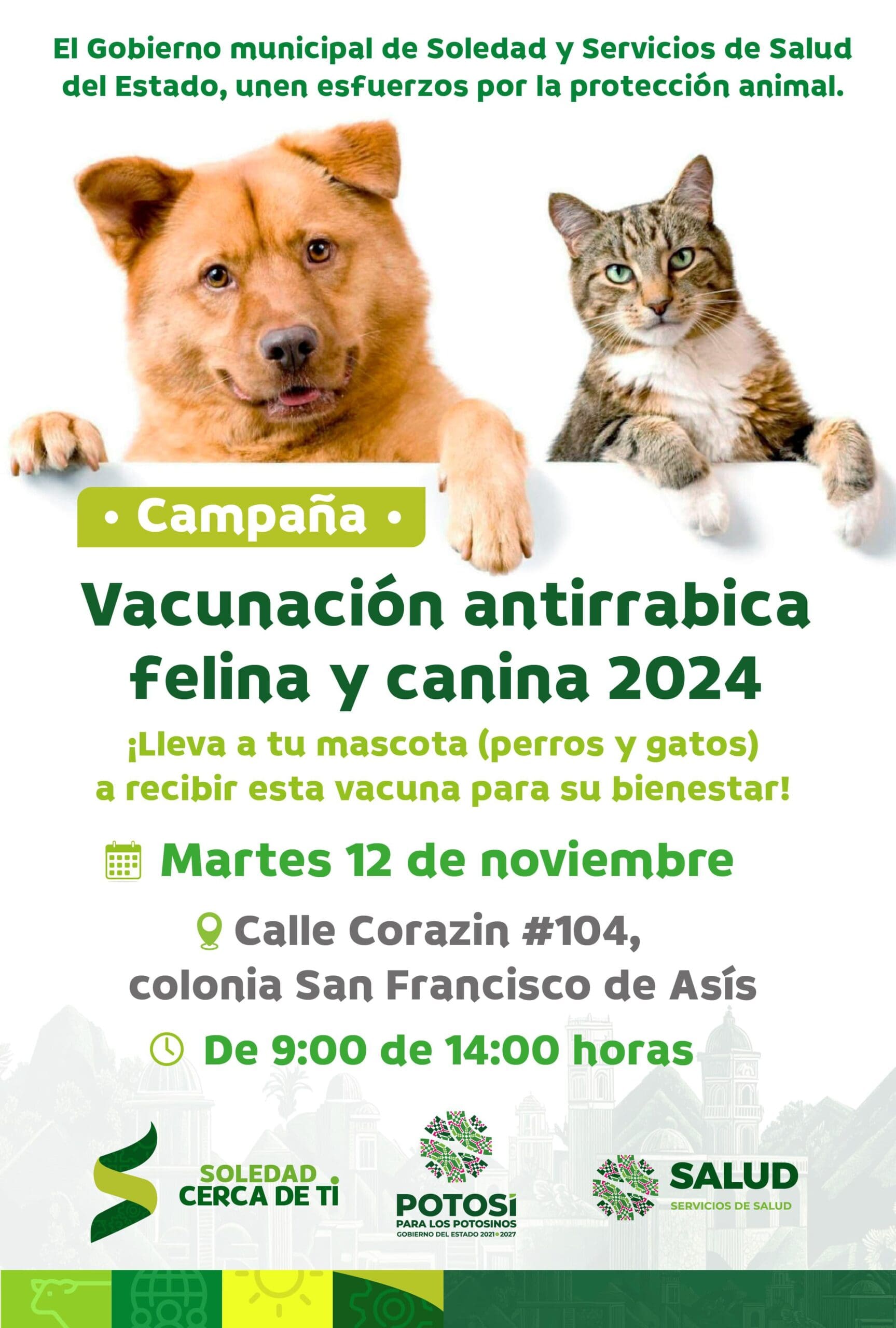 En una muestra más de que el municipio de Soledad de Graciano Sánchez continúa siendo un referente en el cuidado y protección de los animales, y es un ejemplo a seguir en todo el Estado Potosino, el Ayuntamiento, a través de la Dirección de Ecología Municipal, invita a la próxima Jornada de Vacunación Antirrábica Canina y Felina totalmente gratuita.