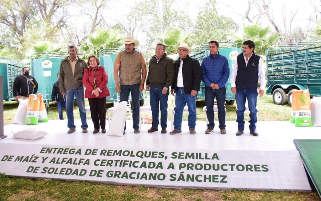 Como parte del respaldo a las comunidades ejidales, se entregaron de manera simbólica 16 remolques en convenio con la Secretaría de Desarrollo Agropecuario y Recursos Hidráulicos (SEDARH), así como 100 sacos de semilla como apoyo municipal, de los cuales 50 fueron de maíz híbrido y 50 de alfalfa certificada; entre lo entregado, se incluyeron cinco camas bajas, un hidráulico de seis toneladas, un rastrillo para tractor y nueve remolques ganaderos.