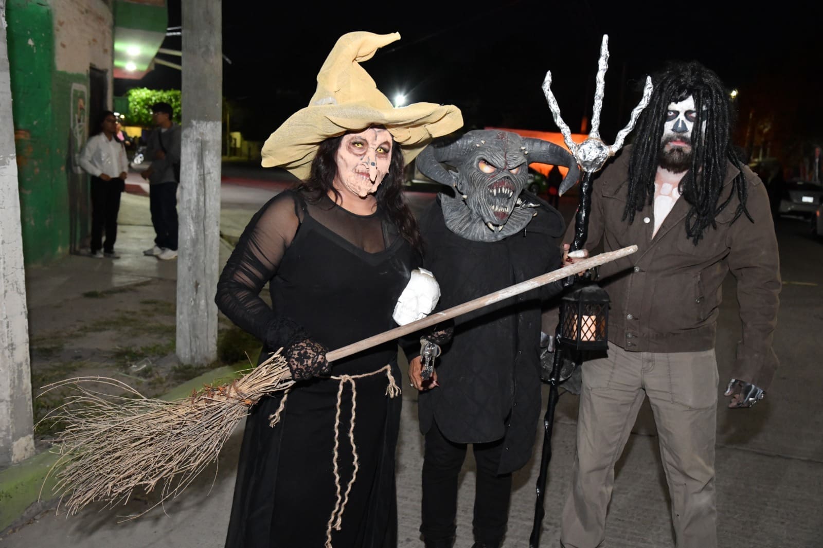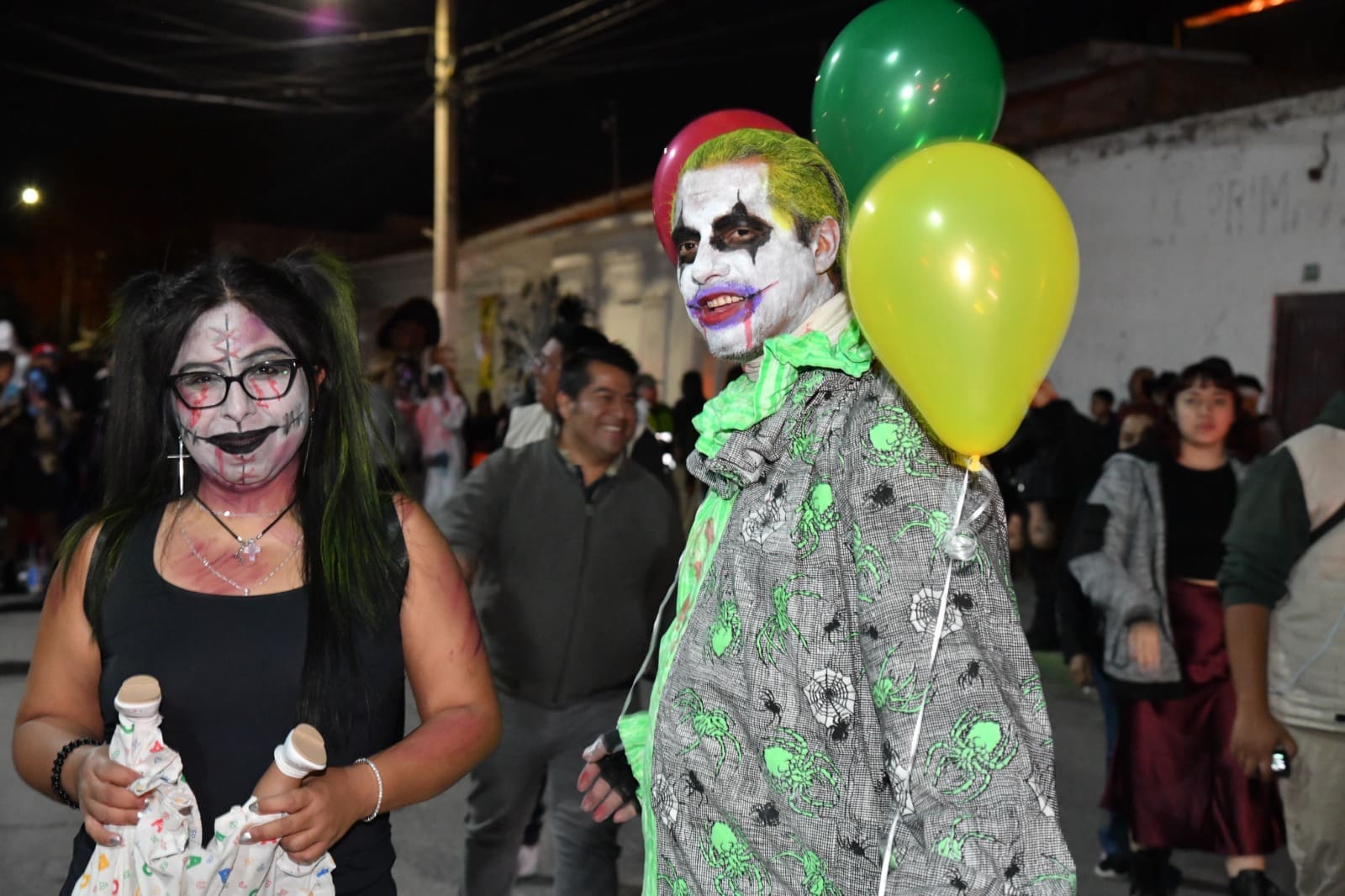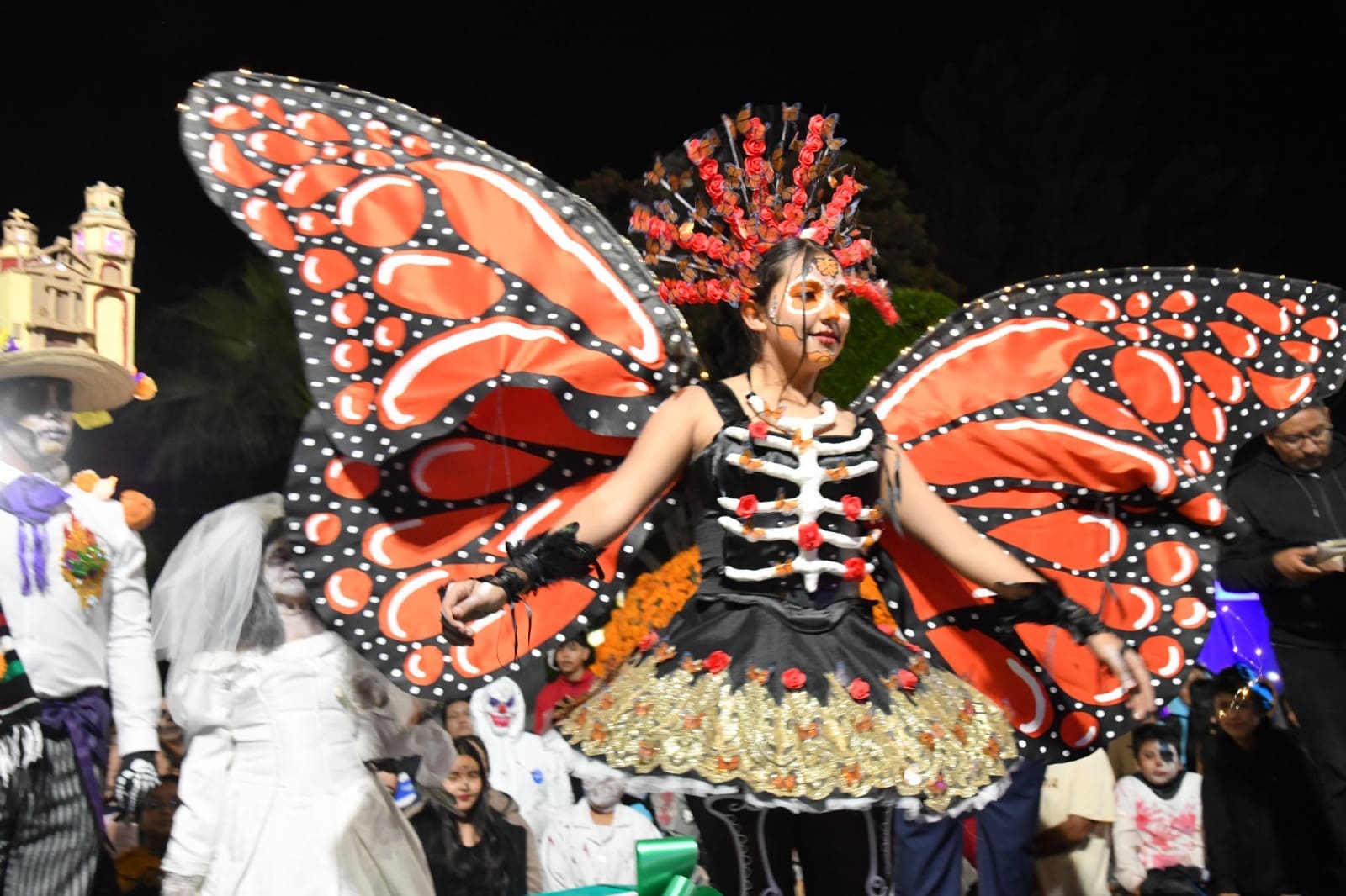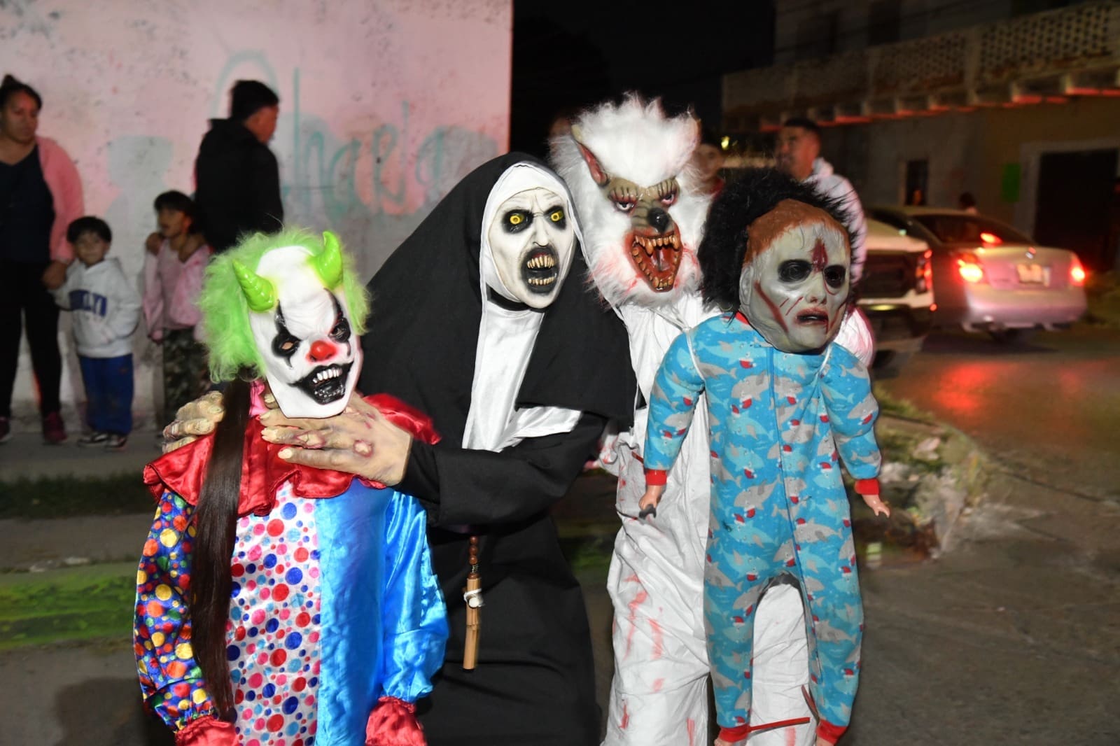 Desde las siete de la noche, el exterior de la Casa de Cultura se llenó de cientos de niños, niñas y personas caracterizadas de carniceros con sierras, seres post-apocalípticos ataviados con trajes de bioseguridad, diablos, zombies, payasos sangrientos, seres sin cabeza o descarnados, brujas, momias, catrines y criaturas terroríficas, que avanzaron lentamente en contingente hacia el Jardín principal, generando asombro y terror entre familias enteras que salieron a disfrutar del espectáculo, algunos con asombro, otros entre sustos y risa.