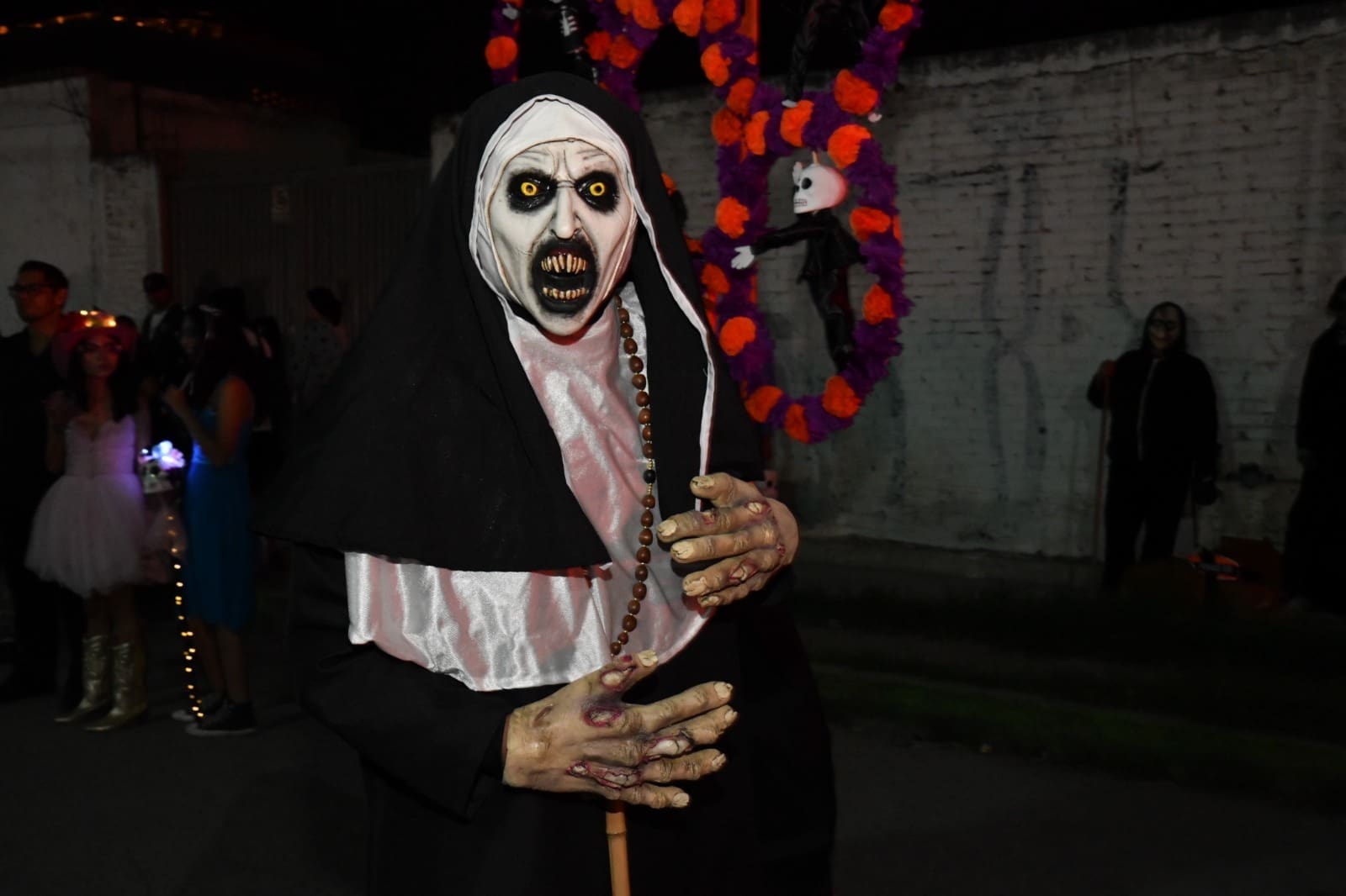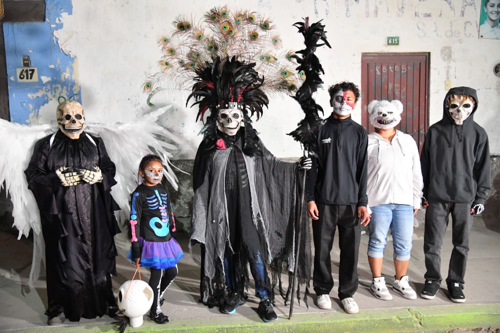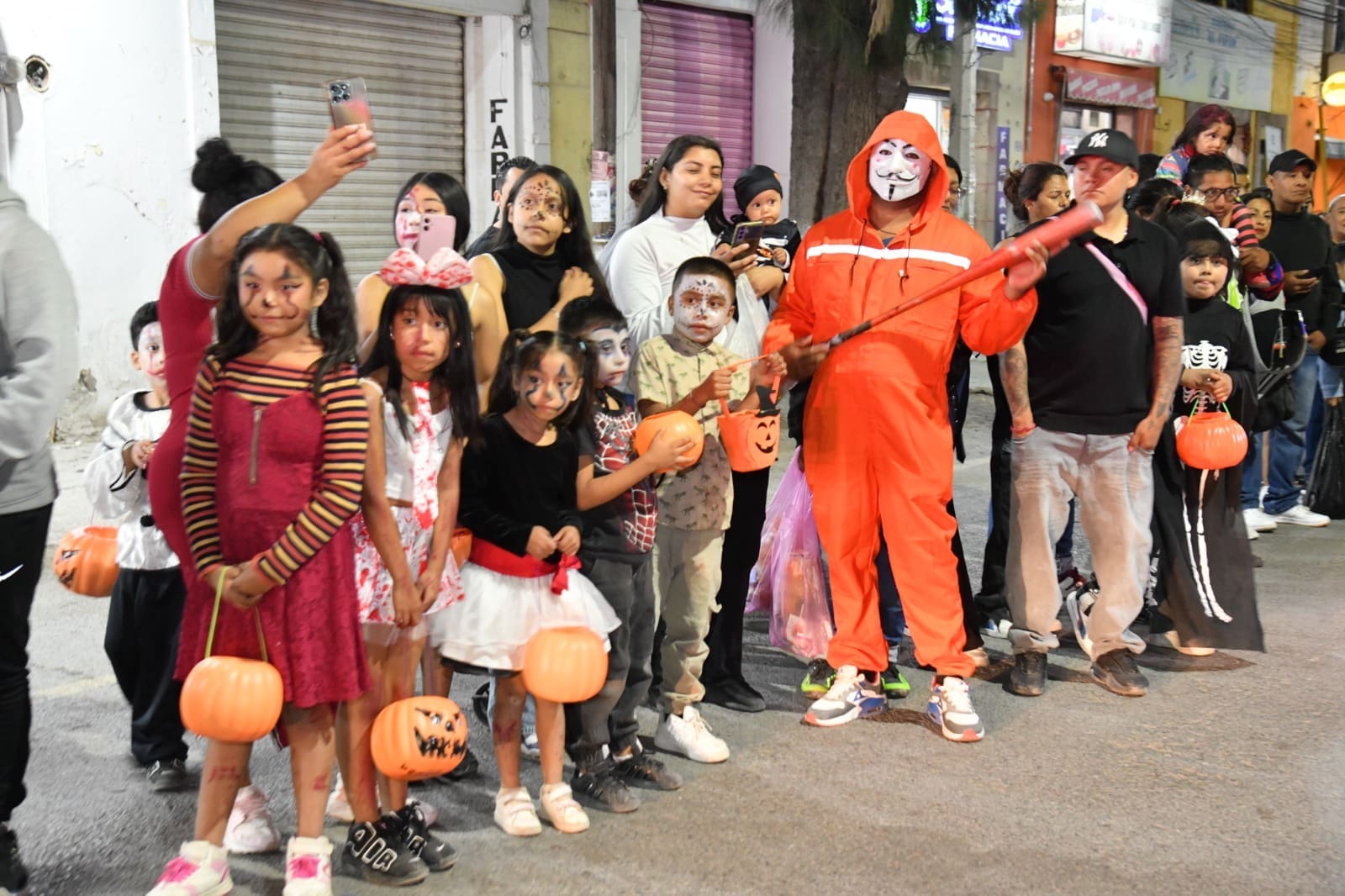 Desde las siete de la noche, el exterior de la Casa de Cultura se llenó de cientos de niños, niñas y personas caracterizadas de carniceros con sierras, seres post-apocalípticos ataviados con trajes de bioseguridad, diablos, zombies, payasos sangrientos, seres sin cabeza o descarnados, brujas, momias, catrines y criaturas terroríficas, que avanzaron lentamente en contingente hacia el Jardín principal, generando asombro y terror entre familias enteras que salieron a disfrutar del espectáculo, algunos con asombro, otros entre sustos y risa.