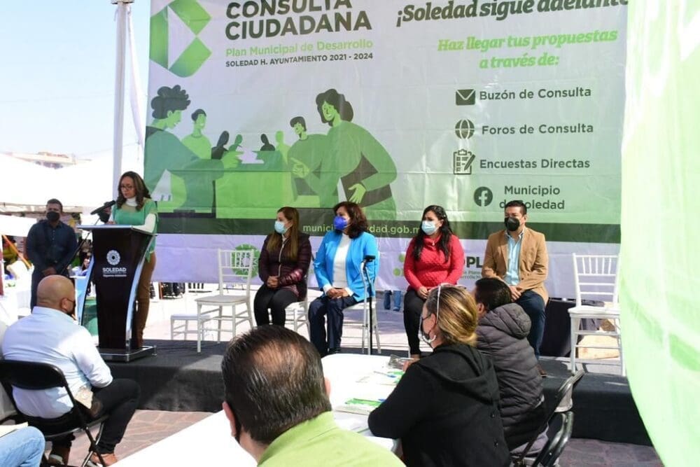Durante su intervención, María Rosa Maldonado Castro Secretaria Técnica Municipal, destacó la participación de las y los soledenses que durante la etapa de Consulta Ciudadana hicieron valer su voz a través de los diferentes mecanismos de participación, entre los que destacan los buzones, foros, encuestas directas y redes sociales.