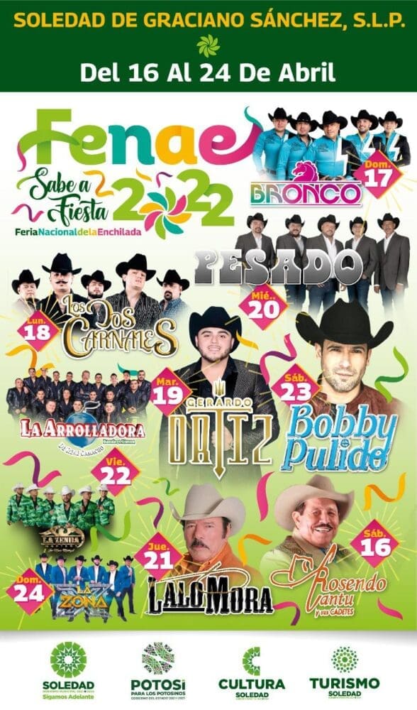 El Ayuntamiento de Soledad de Graciano Sánchez se encuentra listo para la Feria Nacional de la Enchilada 2022, la cual se llevará a cabo del 16 al 24 de abril y ofrecerá a las y los soledenses diversión, gastronomía, música, espectáculos y actividades totalmente gratuitas que llenarán de algarabía al municipio.