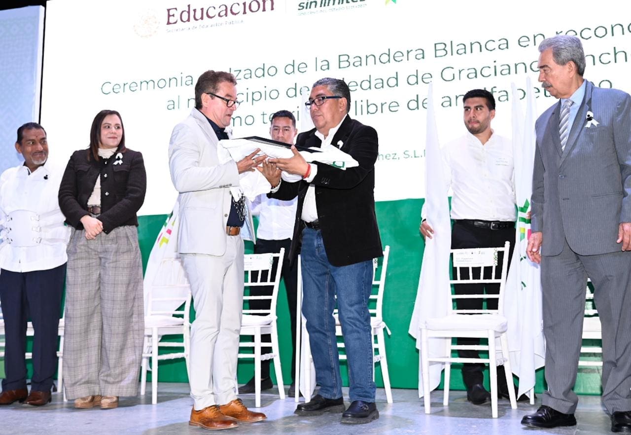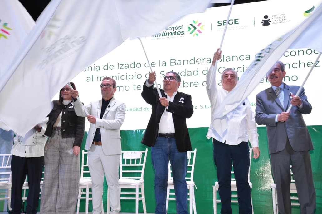 En una significativa e histórica ceremonia, Juan Manuel Navarro Muñiz, Alcalde de Soledad de Graciano Sánchez, encabezó el izamiento de la Bandera Blanca que reconoce al municipio como territorio libre de analfabetismo, un logro único que posiciona a Soledad como el primer municipio de San Luis Potosí en alcanzar este distintivo conforme a los estándares internacionales, y el tercero en México.