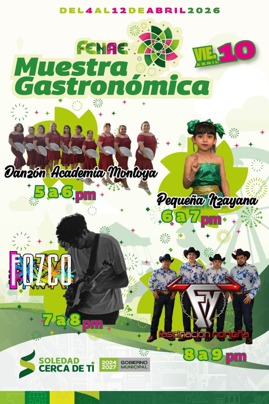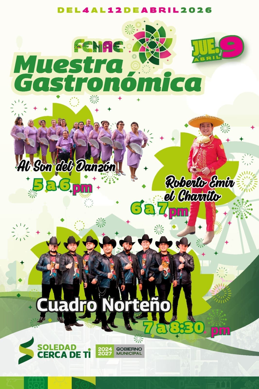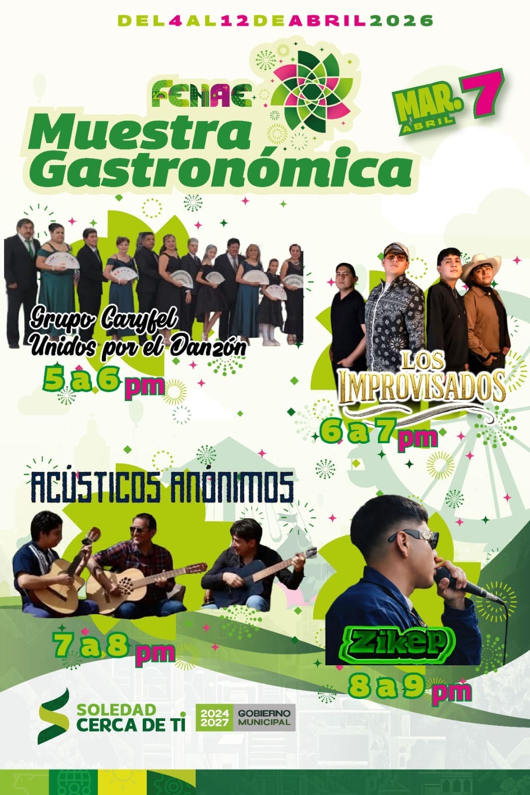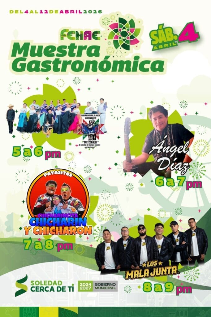 El sábado 4 de abril abrirán escenario la agrupación folclórica independiente Metzonali de Soledad de Graciano Sánchez, seguido del cantante Ángel Díaz, los payasos Chicharincita, Chicharín y Chicharón, y la agrupación musical Los Mala Junta, marcando un inicio lleno de tradición y energía; para el domingo 5, el ritmo continuará con Apasionados del Danzón, Ekos Ocho y Reventón Band, en un ambiente que promete reunir a distintas generaciones alrededor de la música y el disfrute familiar.