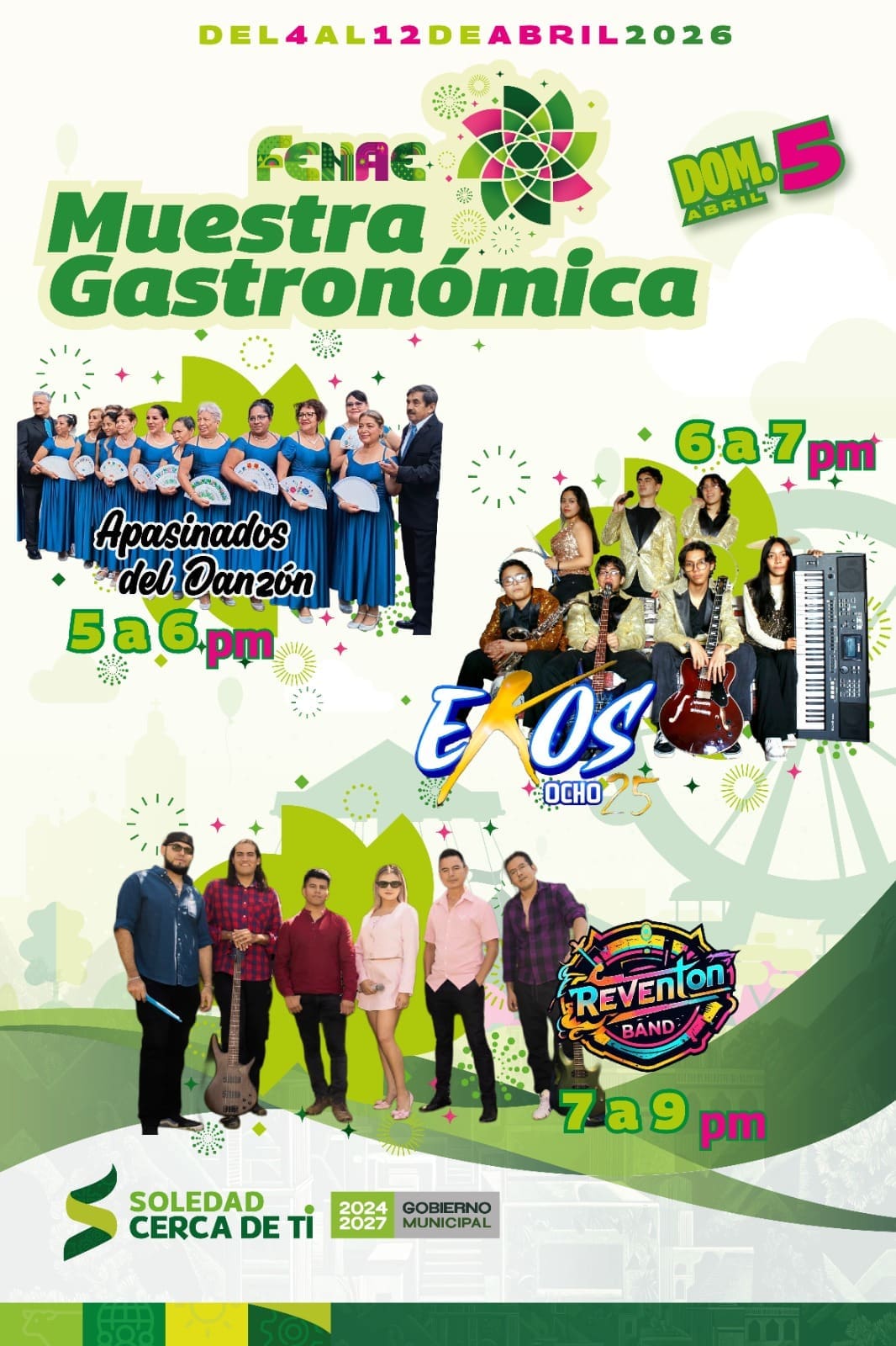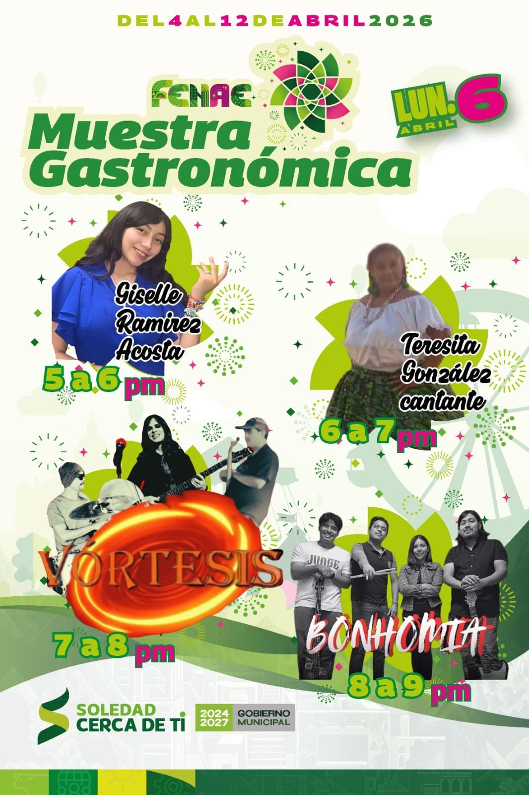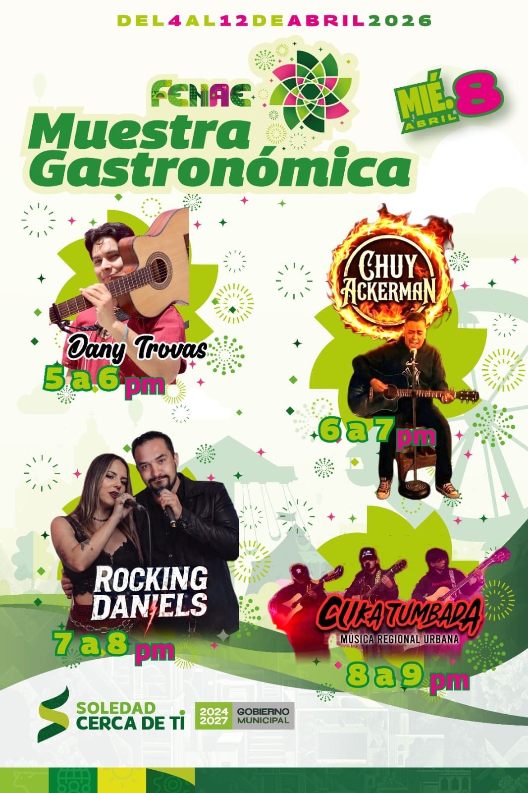 El lunes 6 de abril se presentarán Giselle Ramírez Acosta, la cantante Teresita González, Vortesis y Bonhomía; mientras que el martes 7 será turno de Grupo Caryfel Unidos por el Danzón, Los Improvisados, Acústicos Anónimos y Zikep, consolidando una programación dinámica y cercana al gusto del público. El miércoles 8, el escenario recibirá a Dany Trovas, Chuy Ackerman, Rocking Daniels y Cuka Tumbada, que fortalecerán la diversidad musical y dan impulso a propuestas frescas del talento local.