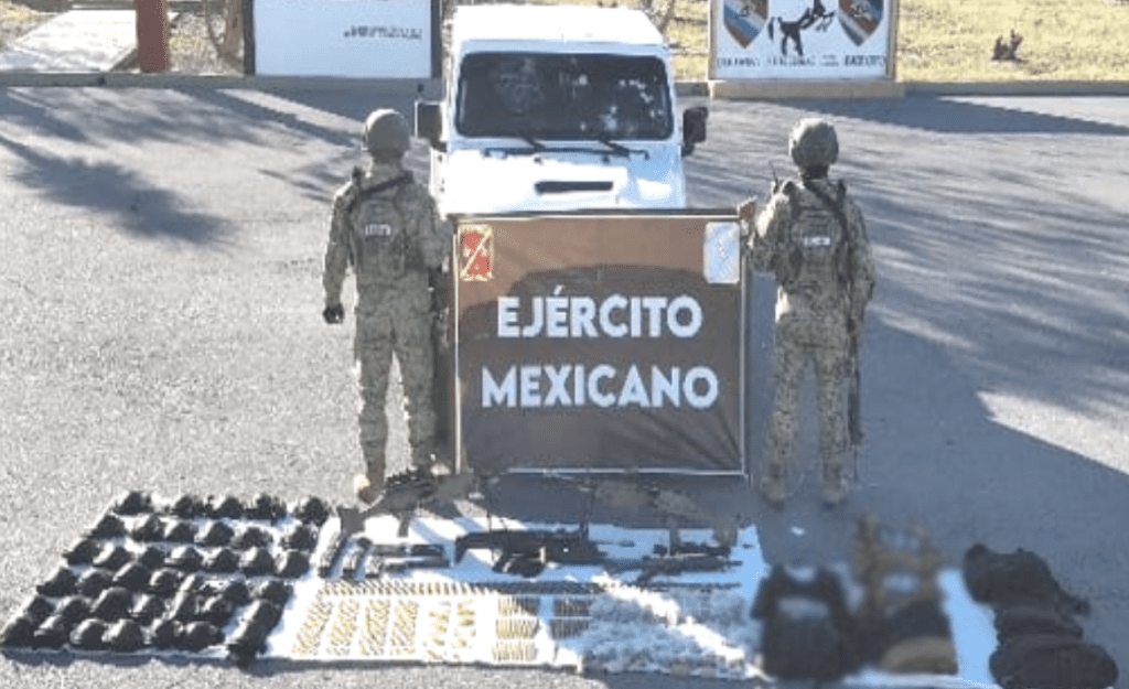 En Camargo, se aseguraron dos ametralladoras, dos armas largas, un lanzagranadas,10 cargadores, 779 cartuchos, ocho chalecos tácticos, 38 pares de coderas, 138 dosis de marihuana y un vehículo.