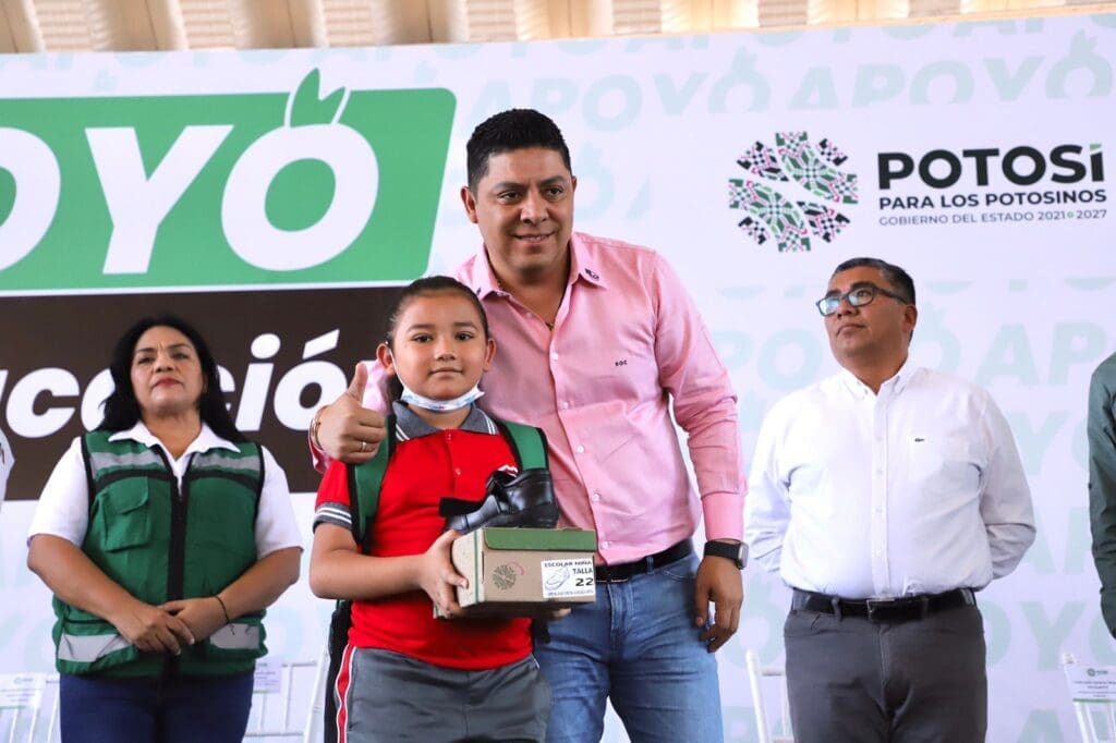 Detalló que en Matehuala se entregarán 14 mil 754 paquetes de útiles escolares, 5 mil 890 pares de zapatos y 4 mil 863 uniformes en beneficio de estudiantes de educación básica en los niveles de primaria y secundaria.