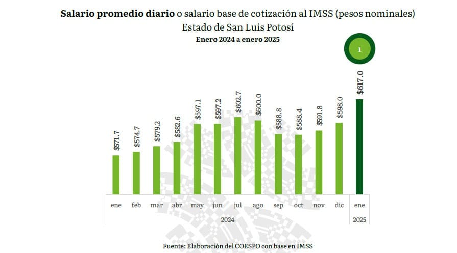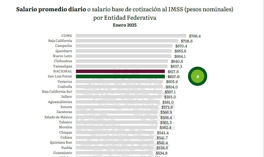 Resultado de una política de desarrollo económico, atracción de empresas y generación de empleos bien remunerados, que acerquen más apoyo a las y los potosinos y sus familias, San Luis Potosí logró la octava posición de las entidades con mayor salario y la segunda en la región al registrar 617 pesos en el salario promedio diario de las y los asegurados del Instituto Mexicano del Seguro Social (IMSS), informó el Consejo Estatal de Población (Coespo).