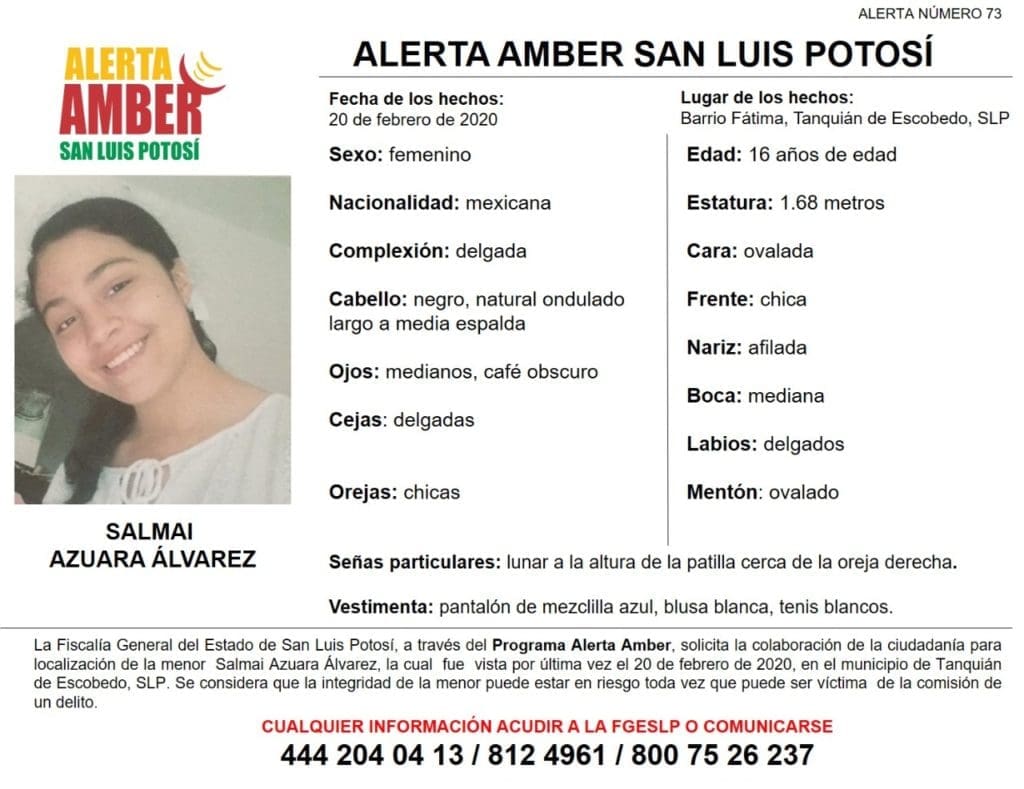 La Fiscalía General del Estado de San Luis Potosí (FGESLP) activó una Alerta Amber para apoyar a la localización de Salmai Azuara Álvarez de 16 años de edad, quien fue vista por última vez en el municipio de Tanquián de Escobedo, sin que hasta el momento se tenga conocimiento de su paradero, por lo que se considera que su integridad se encuentra en riesgo, toda vez que pueda ser víctima de la comisión de un delito.
