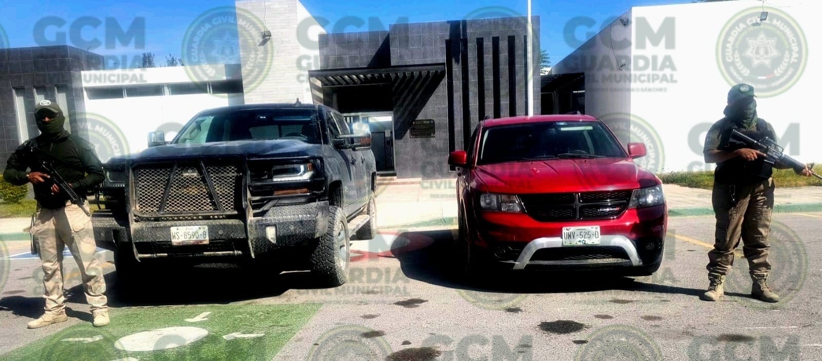 En el operativo policial también se encontró un arma larga con un cargador abastecido, tres radiofrecuencias, dos pasamontañas, pagarés y dos camionetas: una Dodge Journey color rojo y una Pick Up color negra.