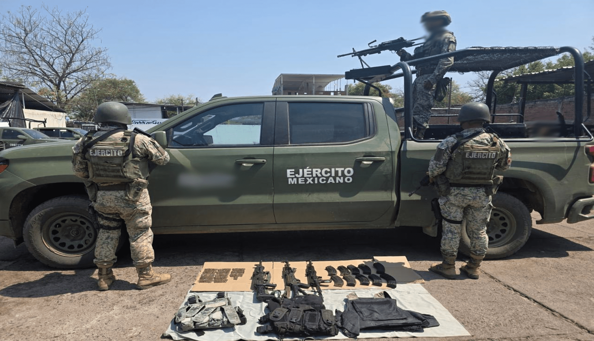 -En Múgica, elementos del Ejército Mexicano localizaron un punto de vigilancia empleado por la delincuencia organizada, aseguraron tres armas largas, 10 cargadores, 133 cartuchos y tres chalecos tácticos.