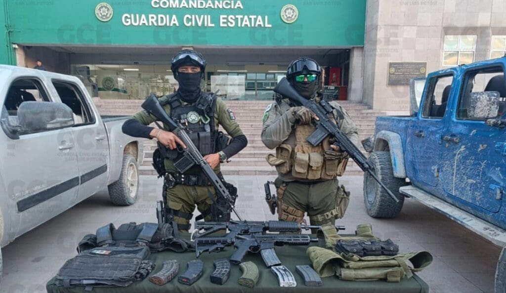 Villa de Arista S.L.P.- Derivado de un reporte sobre el avistamiento de vehículos con gente armada en la Comunidad de El Pozo en Villa de Arista, agentes de la Guardia Civil Estatal, realizaron una incursión operativa terrestre y aérea, logrando el decomiso de unidades, armamento y equipo táctico.
