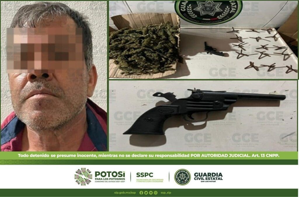Sant a María del Río, S.L.P.- Tras las labores de seguridad y vigilancia, desplegadas para el combate al narcomenudeo, un objetivo criminal generador de violencia fue detenido por elementos de la Guardia Civil Estatal (GCE) después de que se le asegurara más de un kilo de marihuana, artefactos metálicos conocidos como “poncha llantas” y una pistola de fulminantes acondicionada para detonar cartuchos calibre .22.