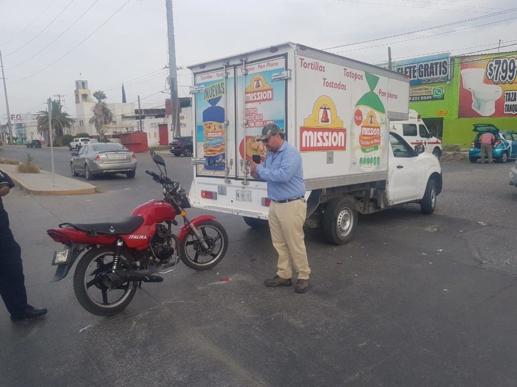 Esta tarde, un motociclista resultó lesionado al chocar contra una camioneta repartidora de tortillas y tostadas, en la Avenida San Pedro.