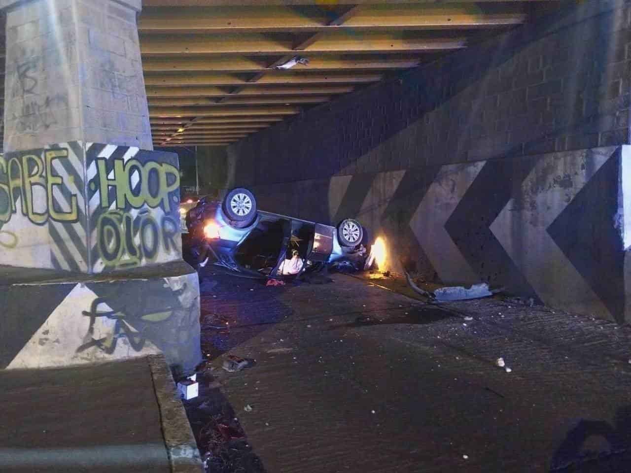 Se trata de un auto Volkswagen que chocó contra un tramo de un muro de contención, lo que ocasionó que el auto volcara y quedará con las llantas hacia arriba, justo debajo del puente.