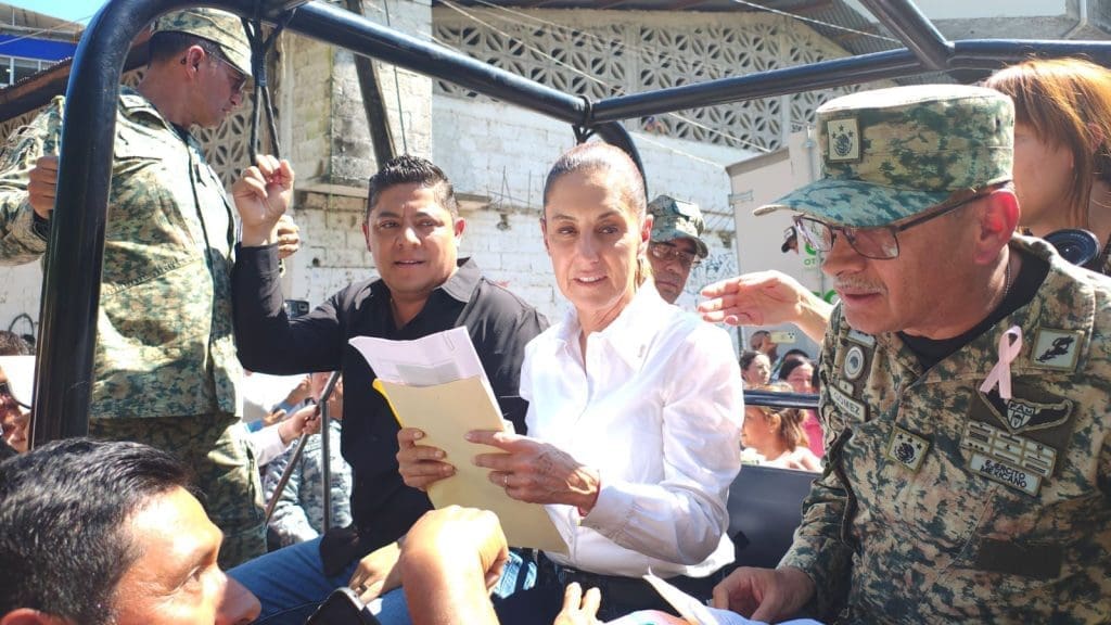 La Presidenta y el Gobernador recorren en un Jeep militar las calles donde han sido recibidos por familias que les agradecen la intervención oportuna ante las inundaciones que afectaron gran parte de la huasteca potosina.