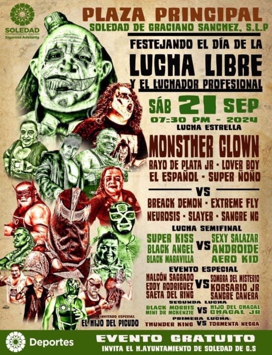 “Desde la instauración del Día Nacional de la Lucha Libre en 2019, no queríamos que Soledad de Graciano Sánchez se quedara atrás, por eso, organizamos una función que será disfrutada por toda la familia, con luchadores como Monster Clown, Rayo de Plata Jr., El español, Breack Demon, entre otros, que traerán acción y emoción a nuestro municipio”, finalizó el funcionario municipal.